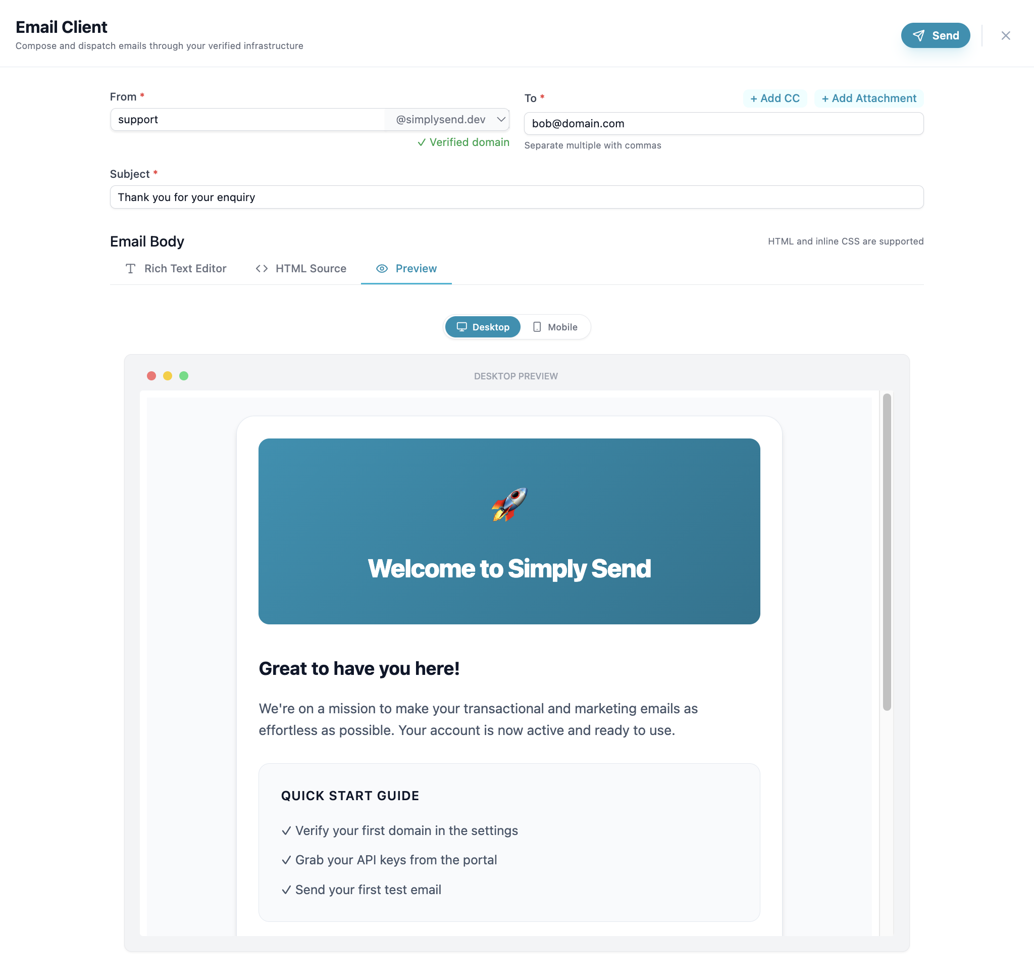 " Simply Send 's client allows me to run 5 different micro-SaaS projects from one account, keeping my overhead almost zero while maintaining a professional presence."