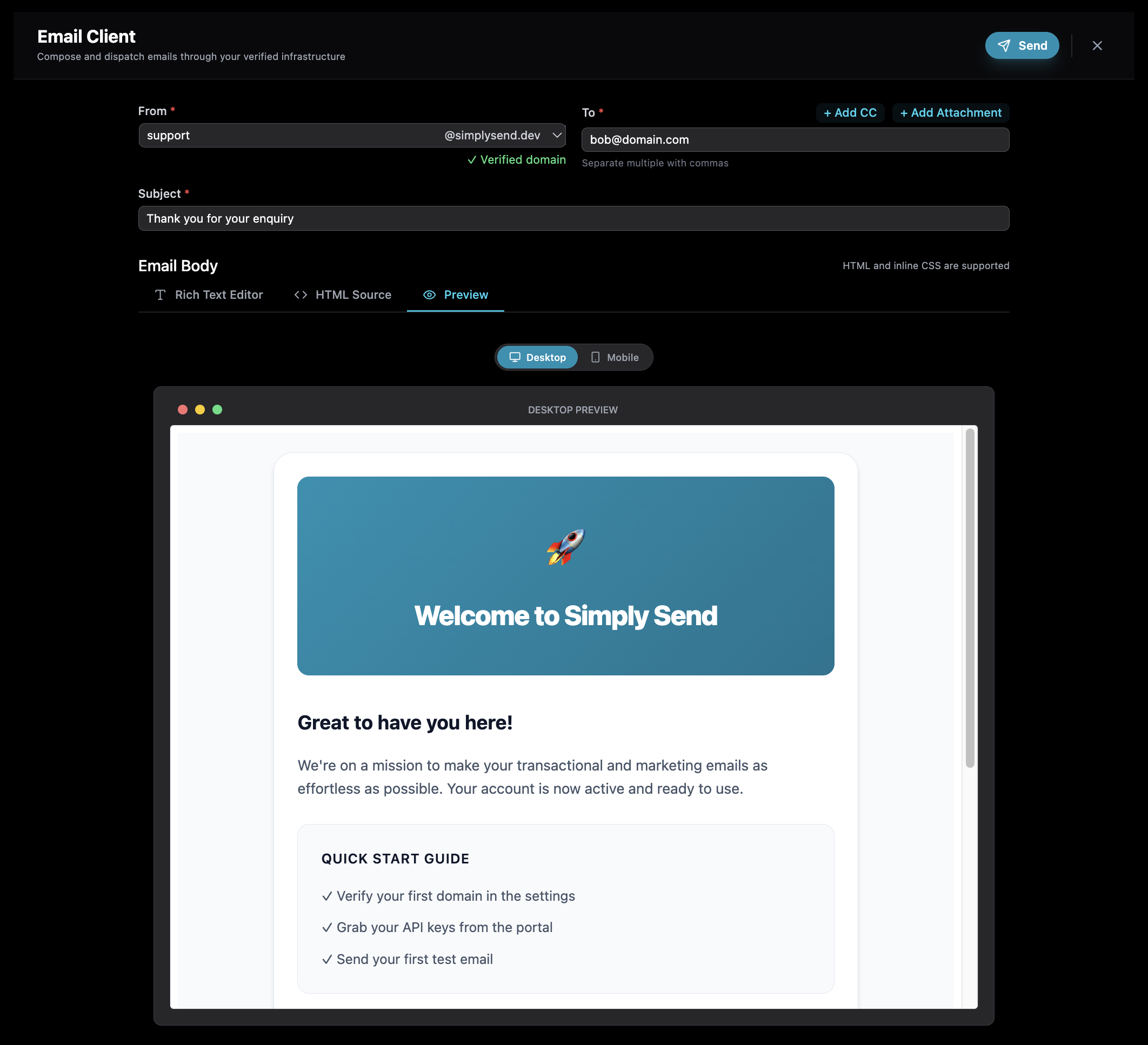 " Simply Send 's client allows me to run 5 different micro-SaaS projects from one account, keeping my overhead almost zero while maintaining a professional presence."